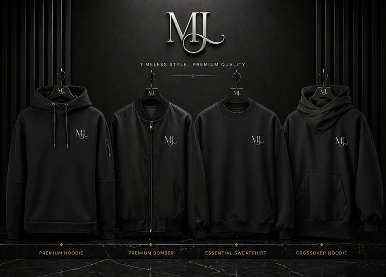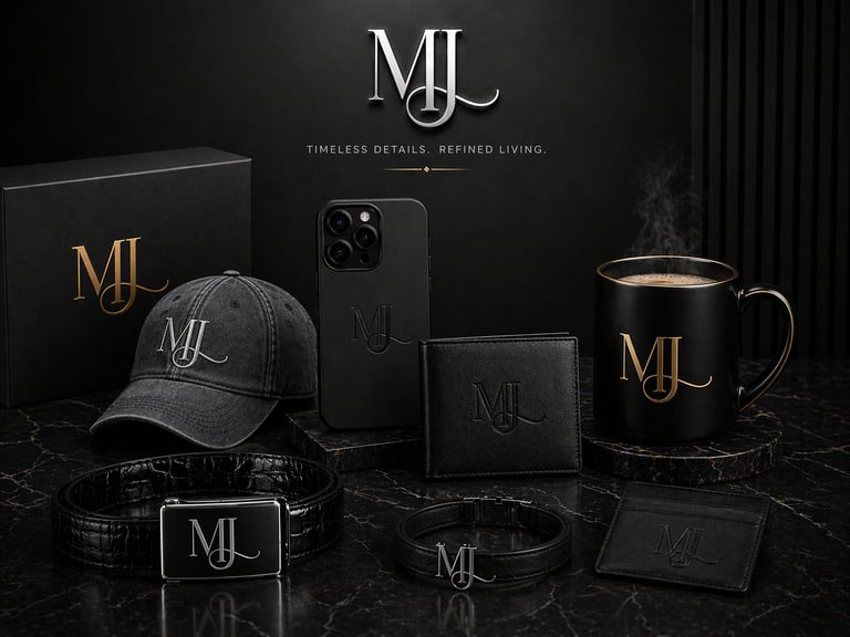A minimalist black snapback hat featuring the mj originals logo, resting on a reflective surface with subtle city skyline reflections.